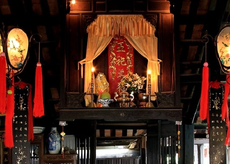 The main doors were made of removable wooden panels, allowing the storefront to open wide to the street – a clever design that facilitated trade. The surrounding walls are adorned with intricate wood carvings crafted by artisans from the renowned Kim Bong carpentry village. Numerous antiques and artifacts remain well-preserved and are still displayed, including horizontal boards and parallel sentences intricately engraved with motifs like the four seasons (mai – lan – cúc – trúc), Eight Immortals, and the trio of Fortune – Prosperity – Longevity. The house exudes a solemn, majestic aura – as if simply standing at the threshold lets you hear whispers of the past.