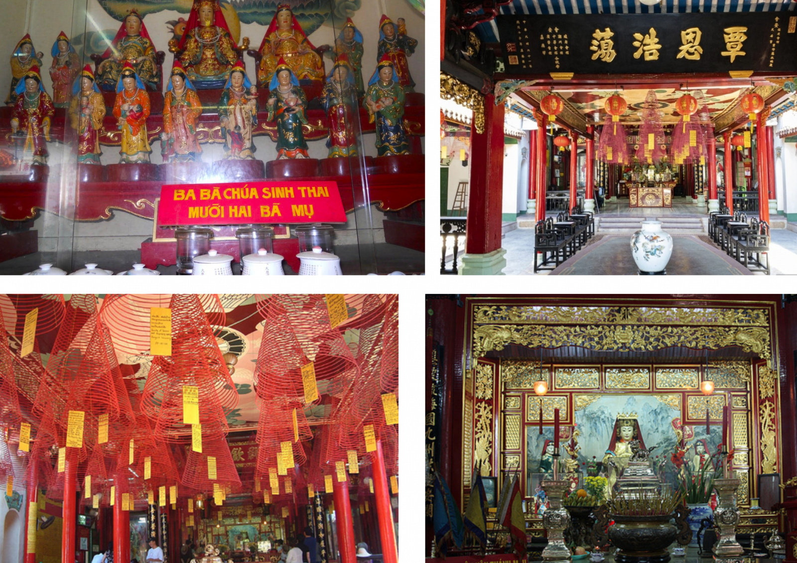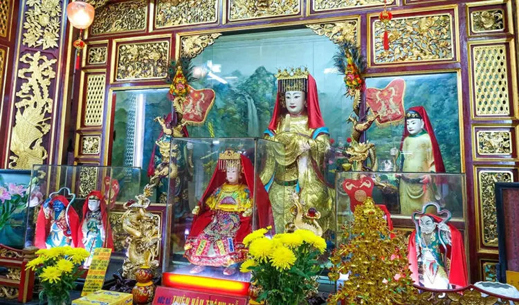 Au cœur de la salle se trouve le temple principal, dédié à la Sainte Mère Céleste, la déesse de la mer. Sa statue, drapée de soie rouge et solennellement installée sur un trône de dragon, dégage à la fois sérénité et grâce. Tout autour, se déploient les autels du Génie de la Richesse, des divinités protectrices, à la Déesse de la fertilité (Ba Chua Sanh Thai) ainsi qu’aux douze Sages-femmes divines (Ba Mu), reflétant une croyance profondément ancrée en la santé, la fertilité et la paix familiale.