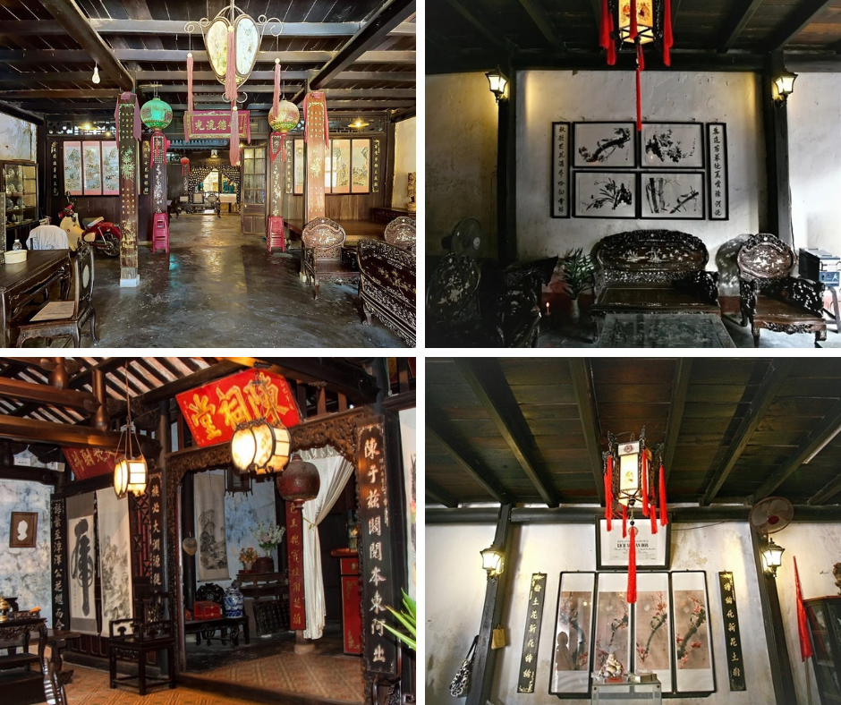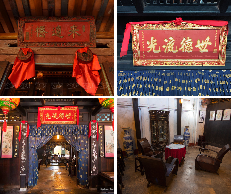 Les portes principales étaient composées de panneaux en bois amovibles, permettant d’ouvrir largement la façade sur la rue - une conception ingénieuse qui facilitait le commerce. Les murs environnants sont ornés de sculptures en bois complexes, réalisées par les artisans du célèbre village de menuiserie de Kim Bong. De nombreux objets anciens sont encore remarquablement conservés et exposés, notamment des panneaux horizontaux et des sentences parallèles richement gravés de motifs traditionnels tels que les quatre saisons (abricotier - orchidée - chrysanthème - bambou), les Huit Immortels, ou encore le trio Bonheur - Prospérité - Longévité.