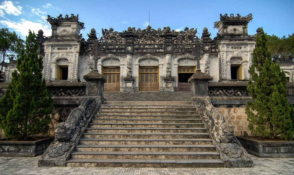 In striking contrast, Khai Dinh Tomb invites visitors into another world—where stone, porcelain, and stained glass blend into a unique fusion of Eastern and Western architecture. Cloud-motif ceilings, the bronze statue of King Khai Dinh, and glimmering mosaics in the main hall create a surreal, dreamlike atmosphere.