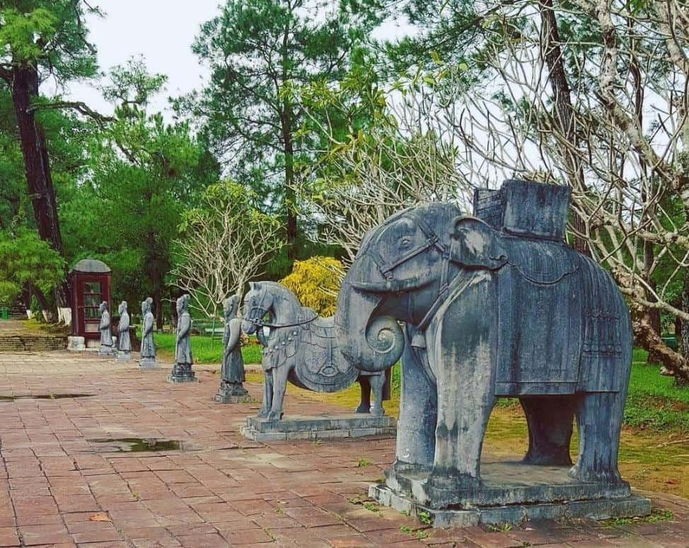 Next is the vast Bai Courtyard, flanked by hundreds of stone statues—elephants, horses, civil officials, and military officers—standing as immortal guards watching over the eternal rest of Emperor Minh Mang. Every carved detail—from the elegant curves of elephant tusks to the sturdy armor of the soldiers—speaks of both majestic power and refined artistry, brought to life by skilled craftsmen centuries ago.