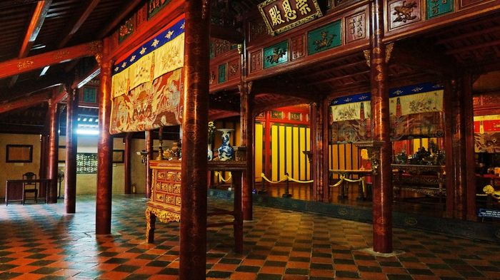 In the main hall, Emperor Minh Mang’s memorial tablet is placed respectfully on an altar, surrounded by gold-leafed couplets and plaques praising his virtues. Each inscription and detail whispers deep reverence, like a timeless prayer echoing the spirit of a wise sovereign through history.